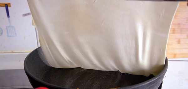3、面團餳好的狀態給你們放個圖,超級柔軟,而且一拉就能延伸出好長。這時候案板上抹上薄薄的一層油防粘,把面團按扁按長,再用搟面杖搟成長方形的餅皮,盡量薄一點。