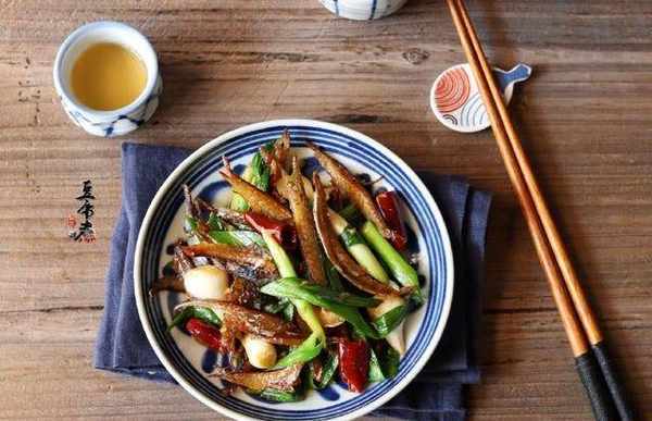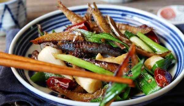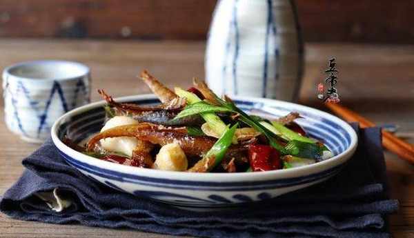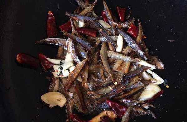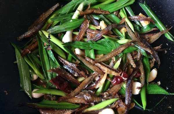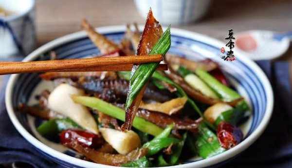 材料:巴浪魚幹200克、蒜苗3根、蒜頭3個、幹辣椒5個、老薑3片、味精1小匙、生抽3匙、