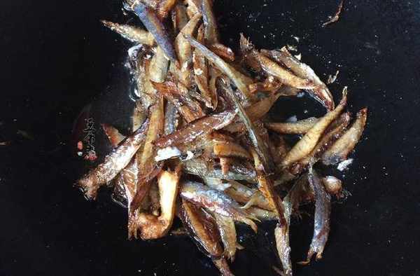 鍋熱油爆幹薑片,再倒入清洗後的咸魚幹。油煸至微微焦