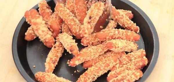 鍋中燒一點食用油,油溫5成熱,放入一根筷子能夠快速的起泡就行瞭。然後把紅薯糯米條放進去炸,一定要小火慢炸,最後把紅薯條炸的全部漂起來,炸至金黃酥脆撈出來。