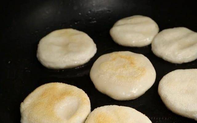 小火慢煎,煎至底面微黃,再翻面煎另一面。