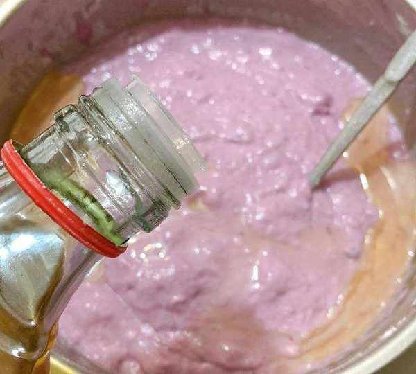 第7步、將120g的紫薯加入白砂糖中。