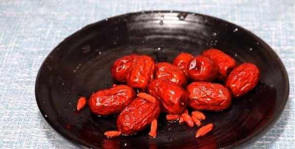 5、將紅棗放在大碗中加入適量的清水,然後再將枸杞放進去,加上適量的面粉,將它們清洗一遍,面粉的吸附性是非常強的,可以吸附它們表面的灰塵和雜質,抓洗完成之後取出控水放入盤中備用。