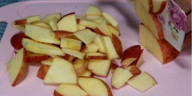 4、洗幹凈以後把蘋果放在案板上,先將其切成小塊,在切塊的同時要將蘋果核全部去掉,切完之後咱們再將其切成片,全部切完片之後放入盤中,然後再將生薑切成片放入盤中,全部切好之後再來處理一下紅棗和枸杞。