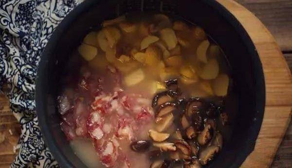 將泡好的米放入電飯煲中,加入泡香菇的水(不夠再加適量清水),滴入幾滴白醋,水量高出米1厘米左右即可。把香菇、栗子和香腸也都放入。按下開關,精煮45分鐘。