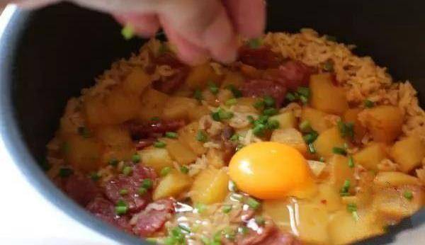配料:土豆中等大小1一2個、香腸1根、雞蛋1個、蔥2一3根、生抽2湯匙、老抽1湯匙、料酒半湯匙、糖一湯匙、海天拌飯醬2湯匙、白醋幾滴、油適量、大米三人份、水適量 。