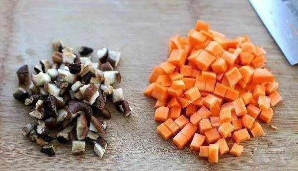 .將泡發的香菇和胡蘿卜切成小丁 。