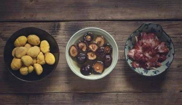 栗子去殼,將栗子肉切小塊些。幹香菇泡發,然後切小塊,泡香菇的水留用。廣式臘腸溫水泡一會兒,然後斜切成片。