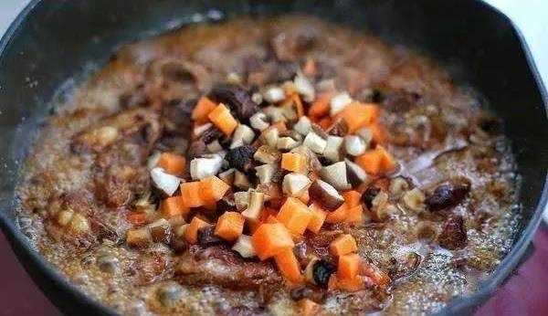 倒入熱水和排骨持平,改中小火燉煮約半個小時,待鍋內剩少許湯汁時加入香菇和胡蘿卜翻炒均勻。