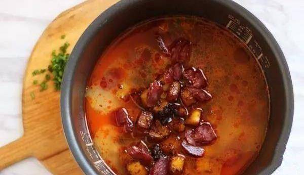 將鍋中土豆連同調味放入電飯鍋中,香腸也放入。