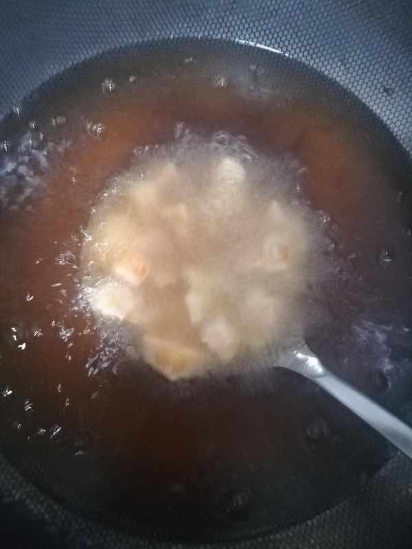 第四步:鍋裡加油燒至五層熱下入盛有紅薯塊的漏勺慢慢炸至定型後,再改中小火炸至金黃如圖