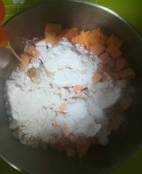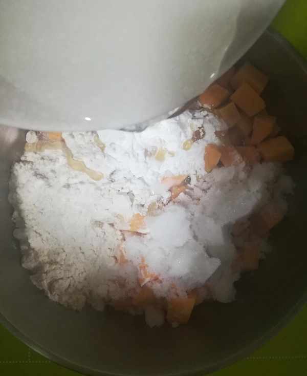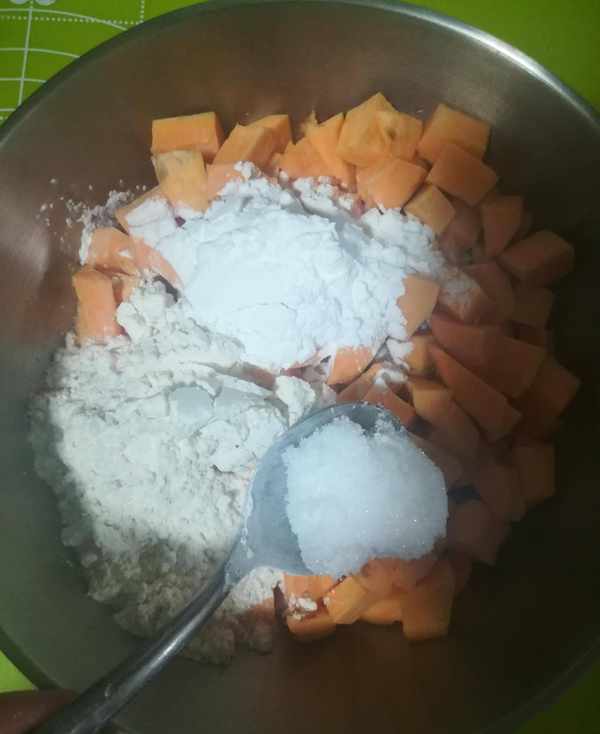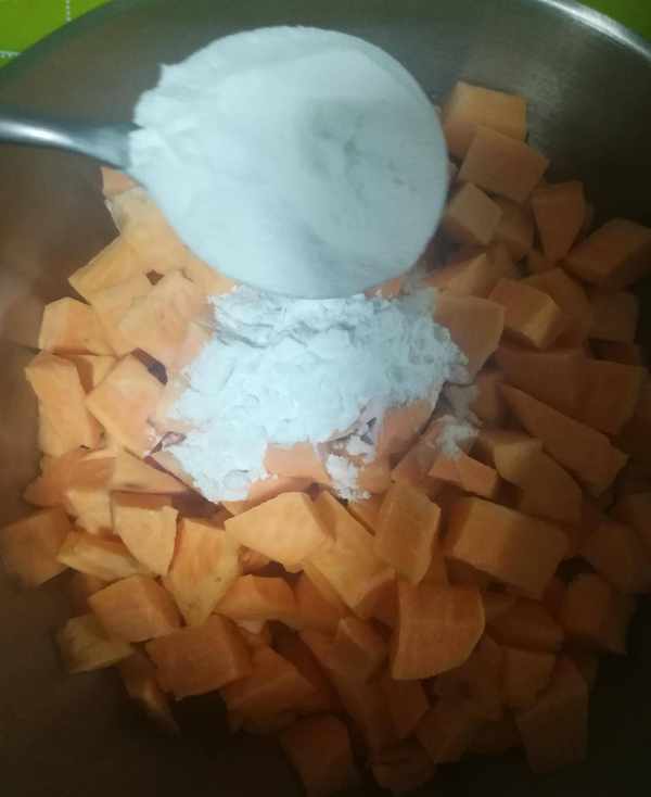 第二步:切好的紅薯塊中加入面粉兩大勺,玉米淀粉一大勺,白糖一大勺(喜歡甜一點的可以多加一些),一大勺蜂蜜和適量的清水一起攪拌均勻如圖