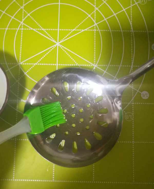 第三步:另把漏勺用小刷子刷上薄薄的一層油後,加入攪拌均勻的地瓜塊如圖