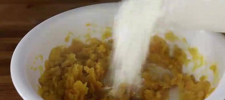 首先把紅薯的外皮去掉。然後切成薄片,裝入盤中,冷水上鍋,水開蒸40分鐘,這時候倒入大碗中,用搟面杖壓成泥。再加點食用鹽,面粉攪拌成絮狀,然後下手揉成面團。撒點幹面粉,再把面團揉出上勁,面團整理一下,按扁用搟面杖搟薄。