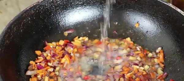 搟好以後再切成條,再橫著切成小塊,盤中刷上食用油,再把切好的面劑放入盤中。上面再倒入食用油,蓋上保鮮膜醒發30分鐘。香菇去掉根部,先切片,再切丁。洋蔥切成小碎丁。胡蘿卜先切片再切條,最後切成小碎丁。紅椒先切條再切丁。等有油熱後加入洋蔥丁翻炒,接著再加入香菇胡蘿卜丁翻炒一分鐘。加碘、食鹽、生抽蠔油翻炒均勻。然後下入辣椒丁再翻炒一下,在加入適量的清水。