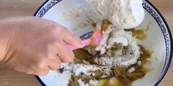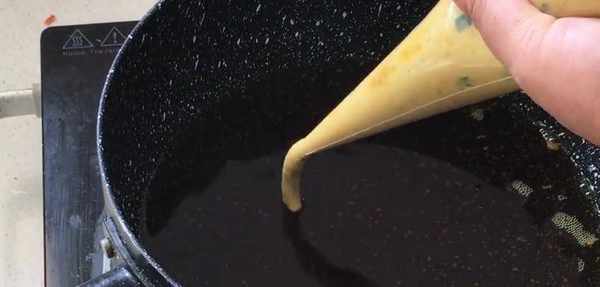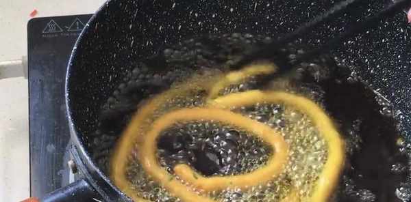 加一大勺的面粉攪拌均勻,不用下手揉,直接攪拌成面糊,放入裱花袋裡面,剪一個小口,鍋中多加一些油燒熱,擠入面糊,盡量擠得長一些,邊擠邊轉圈,中小火炸至金黃即可撈出控油。