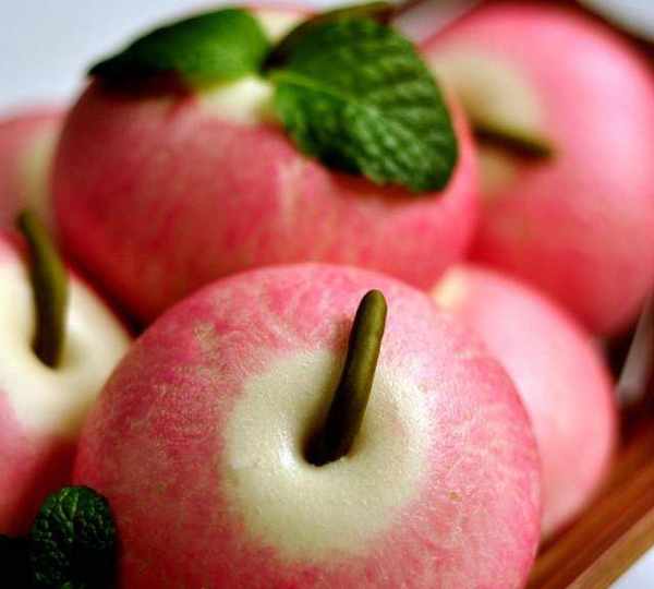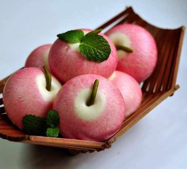 第7步、綠色面團搓細做成梗,放在小坑裡,生坯就做好瞭。放在蒸盤裡,醒發至2倍大。