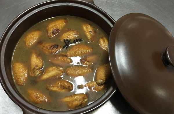 第四步:鍋中加入底油,下大蔥薑煸炒出香味後淋料酒,倒入裝有雞翅的砂鍋中然後加鹽味調味,放到火上小夥燉20分鐘左右即可。