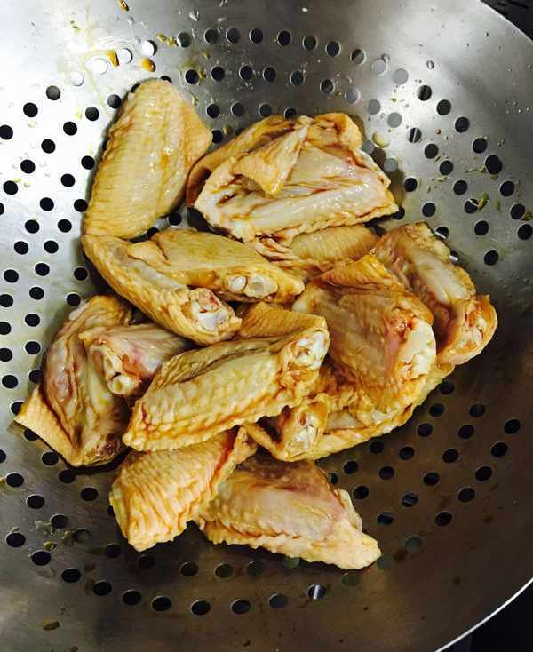 第二步:鍋中加油燒到6成熱將雞翅下鍋炸至金黃。(這裡也是一個小妙招,拌過醬油的雞翅炸出來顏色金黃)