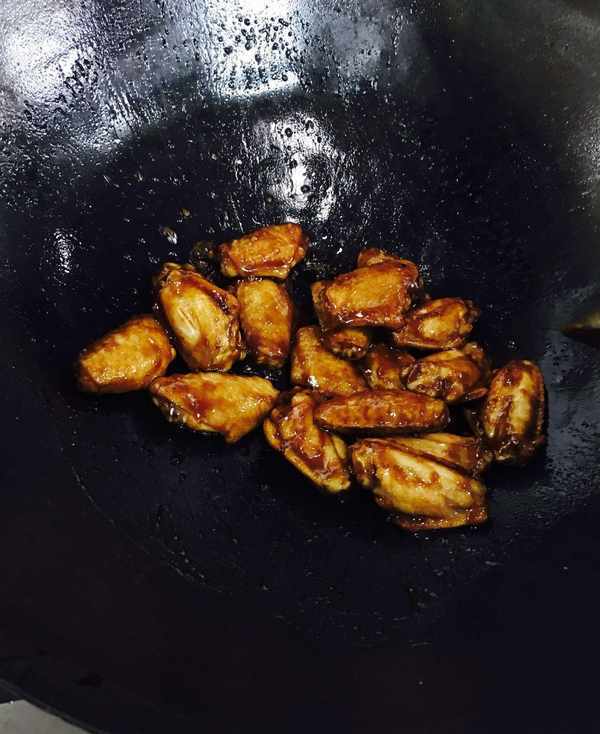 第三步:將鍋內油倒出,加適量的水和白糖炒出糖色,在糖色變色時加入大料、雞翅大火翻炒直至雞翅均勻的裹上糖色,然後加水燒加少量的胡椒粉,放到一個砂鍋裡。