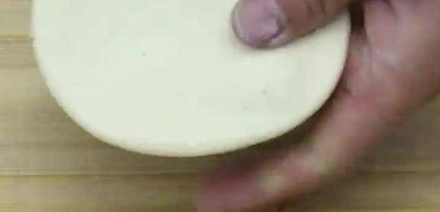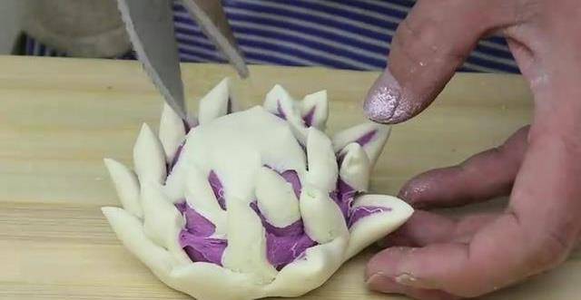 然後將白色的面團搓成長條,切成大小均勻的劑子,取出其中一個劑子,揉好以後整理成圓形,按扁,用搟面杖搟成薄餅,改好之後把紫色的面團包起來,整理一下,把面團整理出饅頭的形狀,用剪刀剪出一個花形。