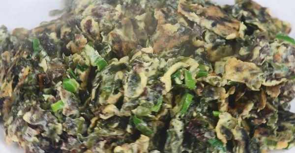7.等兩面都煎制定型瞭,就可以用鏟子攪動瞭,要把煎好的蛋餅給攪碎,並且在大火下翻動,要炒2分鐘左右。等時間到瞭,就可以關火瞭,用鏟子將炒好的美味給舀出來,放在盤子裡,就可以端上桌和朋友分享瞭。一道美味的紫菜雞蛋就制作完成瞭。
