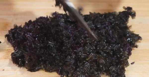 4. 2分鐘之後,紫菜就泡好瞭。先用手將紫菜撕得小一點,然後撈出來,擠幹紫菜裡多餘的水分,放在案板上。等把所有的紫菜都放在案板上瞭,取出菜刀,開始切紫菜。註意瞭,切的時候要橫著切完,再豎著切,反復地切兩次,將紫菜切碎。