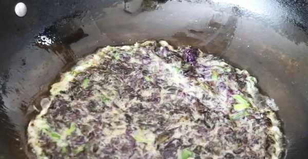 6.取出傢裡的炒鍋,給裡面倒進去適量的食用油,開中火加熱。等鍋裡的油溫有六成熱瞭,將紫菜雞蛋液倒進鍋裡,用鏟子將它們給鋪平整,但是不要攪動。等它們的底部煎制定型瞭,再用鍋鏟將它們翻過來,繼續煎制。可能會翻破,沒有關系,繼續進行煎制。