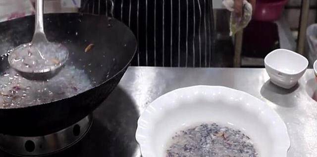 5、白糖溶化後下入紅棗和事先煮熟的黑米,用勺子推動幾下,防止黑米粘鍋。