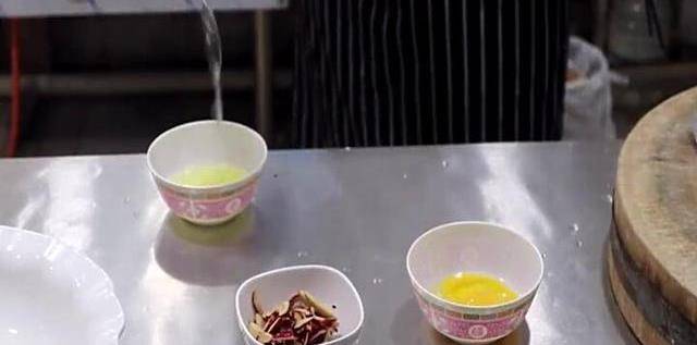3、將雞蛋蛋清和蛋黃分離,分別放入兩個碗中,蛋清裡面加入少許清水,用筷子攪勻打散備用。
