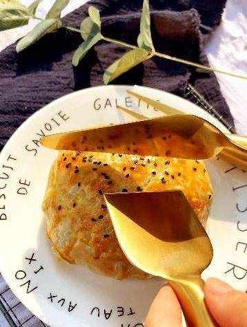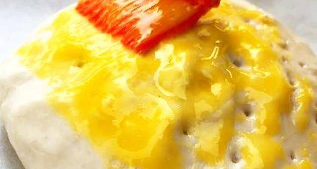 4.將其包裹起來,在上面紮幾個小孔,再取蛋黃液,再把蛋黃刷在手抓餅上面,撒上黑芝麻,放入預熱好的烤箱,190度烤15分鐘