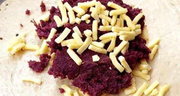 3.然後取一張手抓餅,放上芝士碎,再把紫薯泥放在上面,再鋪上一層芝士碎