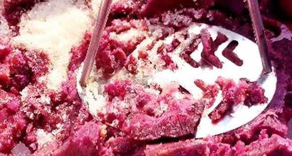 2.蒸熟盛出,加入適量的白糖,用壓泥神奇壓碎