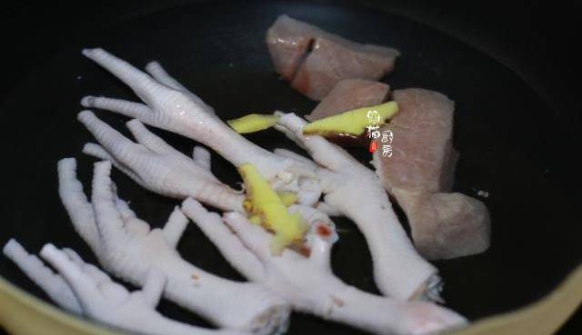 2.再準備幾個雞爪,雞爪最好買新鮮的,也不需要太多,因為雞爪含膠質,這樣熬好的湯,口感比較好。再加上適量的幾塊排骨。我們煲湯並不講究材料多,更註重的是食材的搭配和營養。把雞爪切掉趾尖部位,排骨段和雞爪放入冷水中,加入1勺料酒和少許薑絲去腥,大火煮開,去掉血水和浮沫,然後撈出沖洗幹凈。