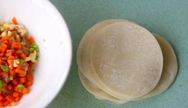 4、餃子皮我是自己在面食店中買的,當然你也可以直接去搟餃子皮,取出餃子皮,把餡放上去開始包就可以瞭。