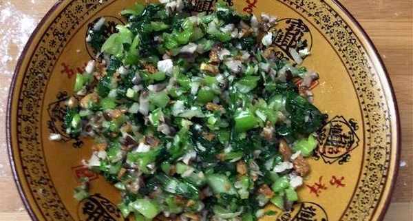 3、攥幹水分,用焯小油菜的水把香菇打下水焯,一定要焯透,大約4分鐘左右,撈出過冷水切碎備用。第三個關鍵點來瞭:小油菜順著切成條,再橫著切成小塊,千萬不能亂刀剁。切面越多越容易氧化變黑。再把多餘的水分攥幹,放在碗裡。還有一點:用油先把小油菜拌上,油能鎖住水分還能保持食材新鮮的顏色。放入香菇、胡椒粉、鹽、雞精、糖提味。我們今天在放點煉豬油剩的油渣子,這樣拌餡特別的好吃啊,攪拌均勻即可。