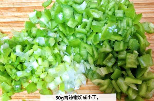 5、豆腐控幹水分後放一邊,把50g青辣椒切成小丁,1根小蔥切成蔥花。
