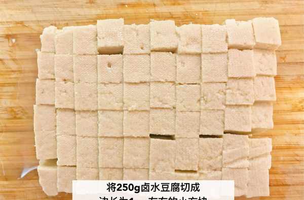 2、面團在發酵的時候,將250g鹵水豆腐切成邊長為1cm左右的小方塊備用。