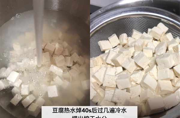 4、豆腐塊焯水40秒後先過幾遍冷水給豆腐降溫,然後再控幹水分。