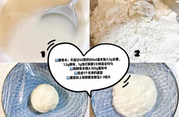 1、制作面團,先在不超過40度的80ml溫水中加入5g白糖、1.5g酵母、1g泡打粉(沒有可不加),靜置5分鐘後混合均勻,然後再將調好的酵母水倒入至150g面粉中,揉成一個光滑的面團,最後封好保鮮膜開始發酵,直到面團體積是原來的2-3倍大即可,大概1小時左右。