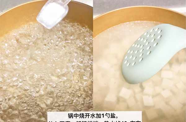 3、豆腐切好後起鍋燒水,等水開後在鍋中加入1勺鹽,放入切好的豆腐塊,輕輕攪拌均勻,焯水40秒左右。
