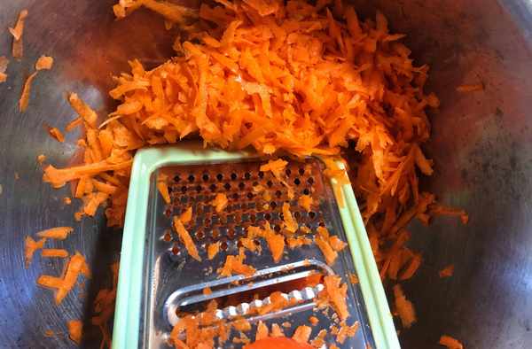 1、先將200g胡蘿卜沖洗幹凈(可不去皮),然後再用擦絲器把胡蘿卜擦成粗絲。