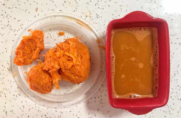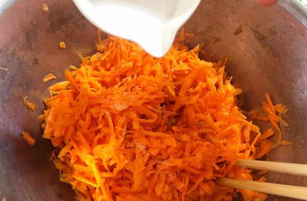 3、胡蘿卜靜置15分鐘後,用手擠出多餘水分,保留擠出的胡蘿卜汁備用。