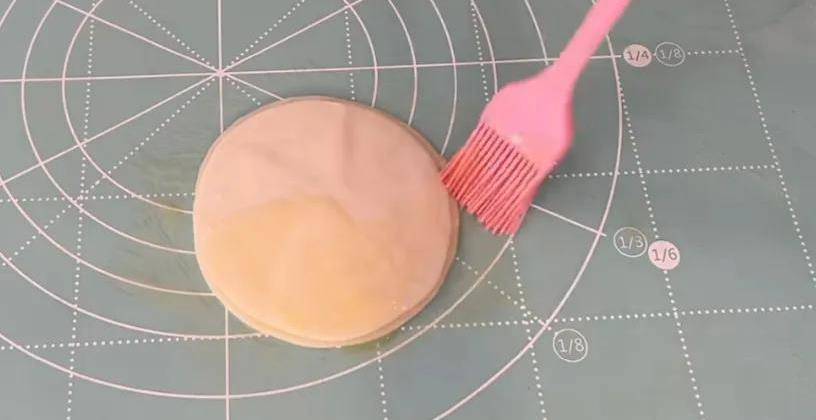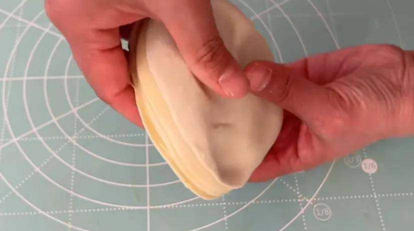 4、全部搟好以後,取一張面皮,刷上一層油酥。上面蓋上一張面皮,繼續刷油酥。重復疊加,每八張為一組,一定要刷均勻,最上面的一張,不用刷油酥。做好以後先不要著急搟餅,從中間向邊緣按壓面皮,一邊轉圈一邊按壓,把邊緣對整齊。