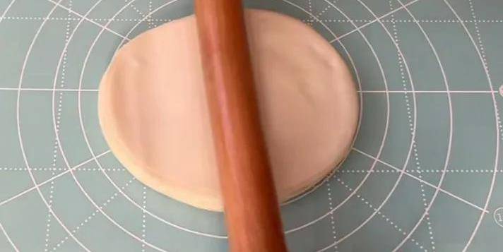 5、 然後開始搟餅,搟的時候將搟面杖放在中間位置,上推下拉,輕輕用力。換個方向,繼續上推下拉,輕輕趕緊。翻個面,用同樣的手法繼續搟。搟的時候也是勤翻面,讓它更加均勻。