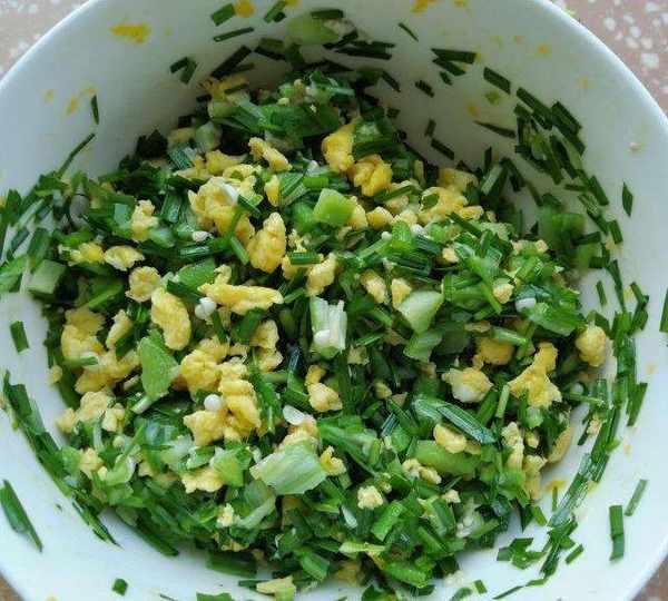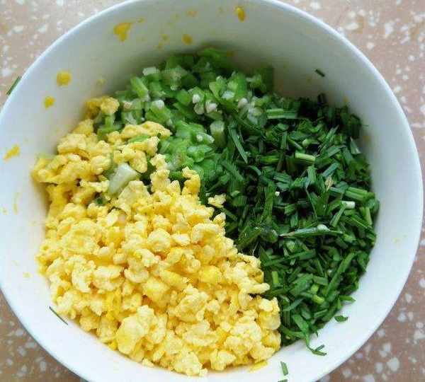第4步、秋葵、雞蛋、韭菜放在大碗中。