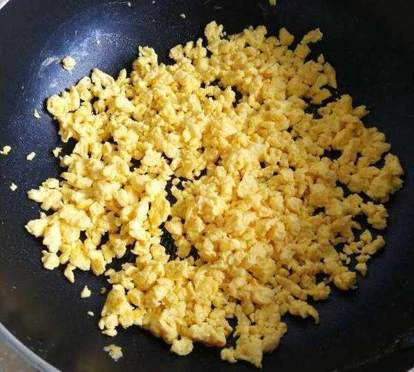 第3步、雞蛋加鹽、料酒、少許水打成蛋液,鍋中放油燒熱,倒入蛋液用筷子攪拌炒成小碎塊。