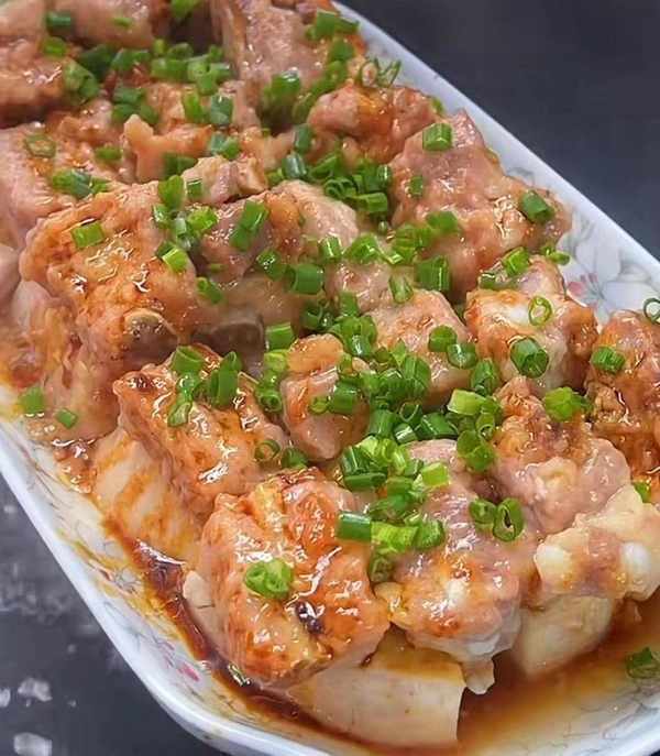 步驟三:準備一個盤子,把芋頭塊擺在底部,再把醃制好的排骨一次擺在芋頭上面,水開上鍋大火蒸十五分鐘。出鍋時撒點蔥花,淋點蒸魚豉油,即可出鍋。芋頭又香又嫩滑,吃起來非常好吃。