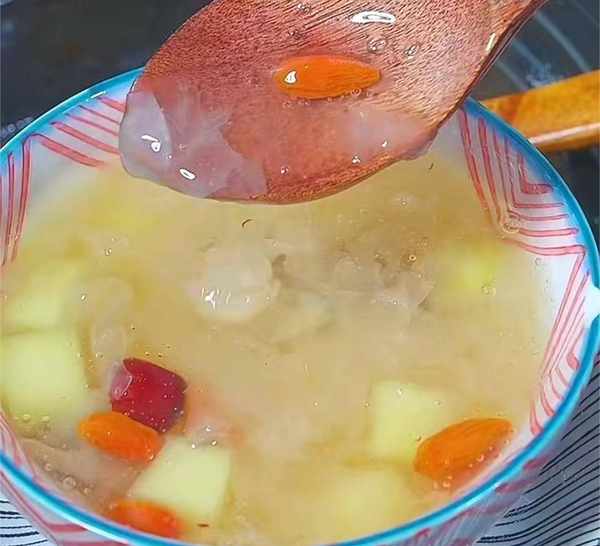 步驟二:將洗凈的銀耳放入砂鍋內,加適量的清水,蓋上鍋蓋,燉煮二十分鐘,用筷子朝著一個方向攪拌,快速攪拌一分鐘,再放入雪梨塊、大棗、白糖,小火再燉煮十分鐘,出鍋時放入枸杞,攪拌均勻即可。一鍋膠質滿滿的銀耳雪梨就做好瞭,秋季潤燥就喝它瞭。