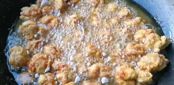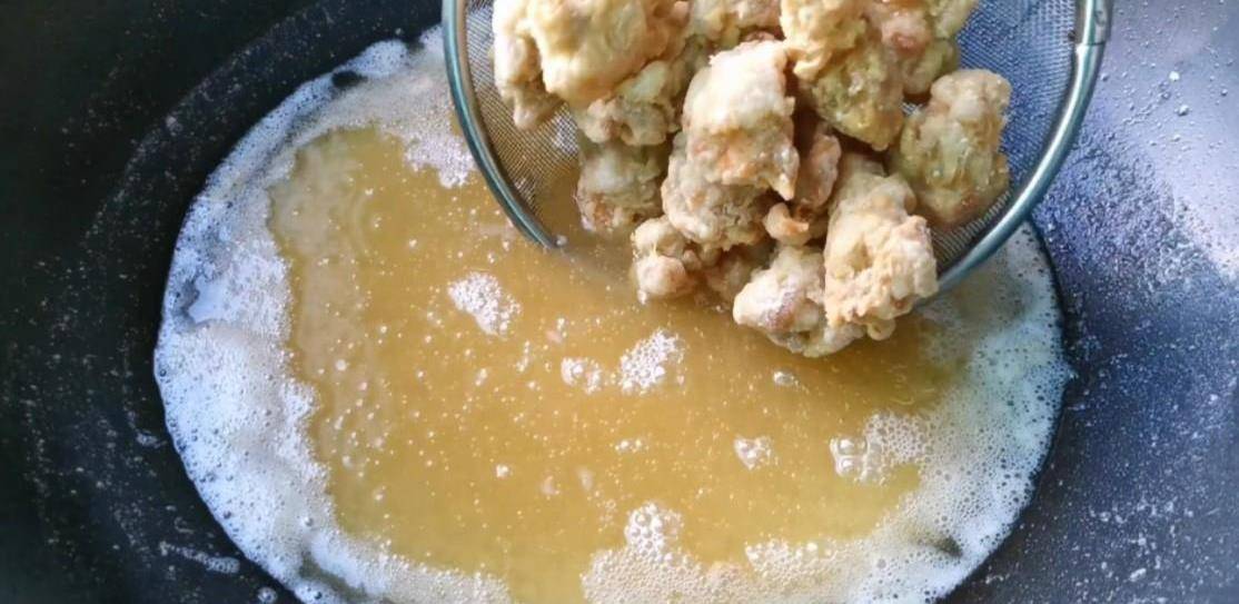 第八步:5分鐘後把雞塊放回油鍋裡復炸,中火慢炸。